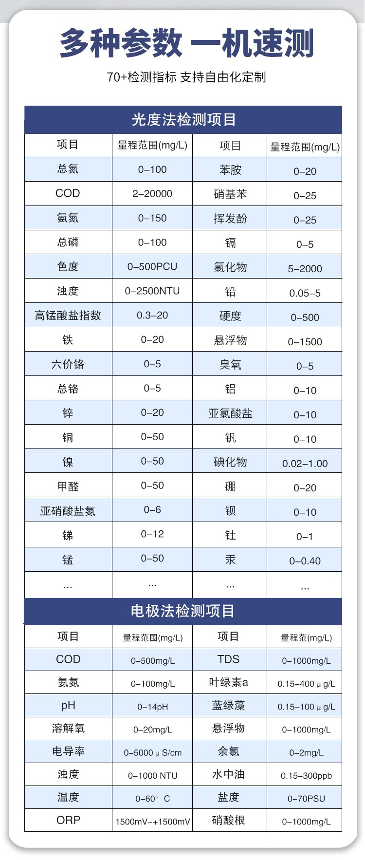 其三,靈活適配多場景 COD 檢測。支持 360° 旋轉比色管檢測(解決管差誤差)、10mm/30mm 比色皿檢測及高精度數字電極檢測,COD 檢測量程覆蓋廣 —— 分光光度法 2-20000mg/L、電極法 0-500mg/L,可應對不同濃度水樣(如清潔水、工業廢水)的 COD 分析,還能兼容氨氮、總磷等百項指標檢測,一機多用減少設備投入。